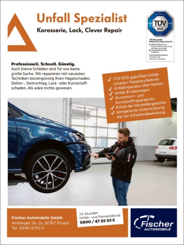Fischer Automobile in Pilsach ist einer der wenigen Betriebe im Landkreis Neumarkt, die vom TÜV SÜD als „geprüfter Unfallschaden-Reparaturbetrieb“ zertifiziert sind. Seit 2019 wird das Unternehmen vierteljährlich unangekündigt vom TÜV SÜD auf die Einhaltung der Vorgaben vor Ort geprüft. Neben den allgemeinen betrieblichen Anforderungen, welche eine hochmoderne Werkstatt-ausstattung und die nachweisliche Qualifikation der Mitarbeiter erfordern, wird ein besonderes Augenmerk auf die Durchführung der Instandsetzungsarbeiten bei Fahrzeugunfällen gelegt. Dazu werden alle Arbeitsabläufe von Fischer Automobile von den Fachleuten des TÜV SÜD genauestens beobachtet, dokumentiert und analysiert. Mit dem Ergebnis, dass sich Fischer Automobile in Pilsach zurecht seit Jahren als TÜV SÜD-zertifizierter Unfall-Spezialist bezeichnen kann.